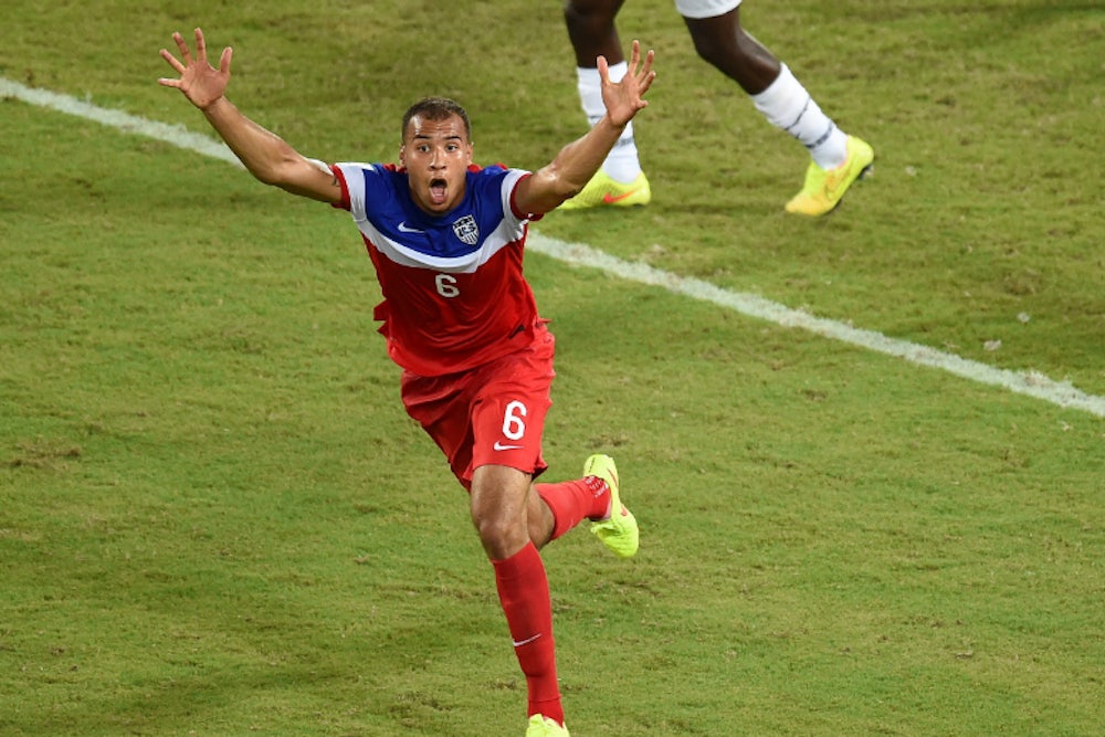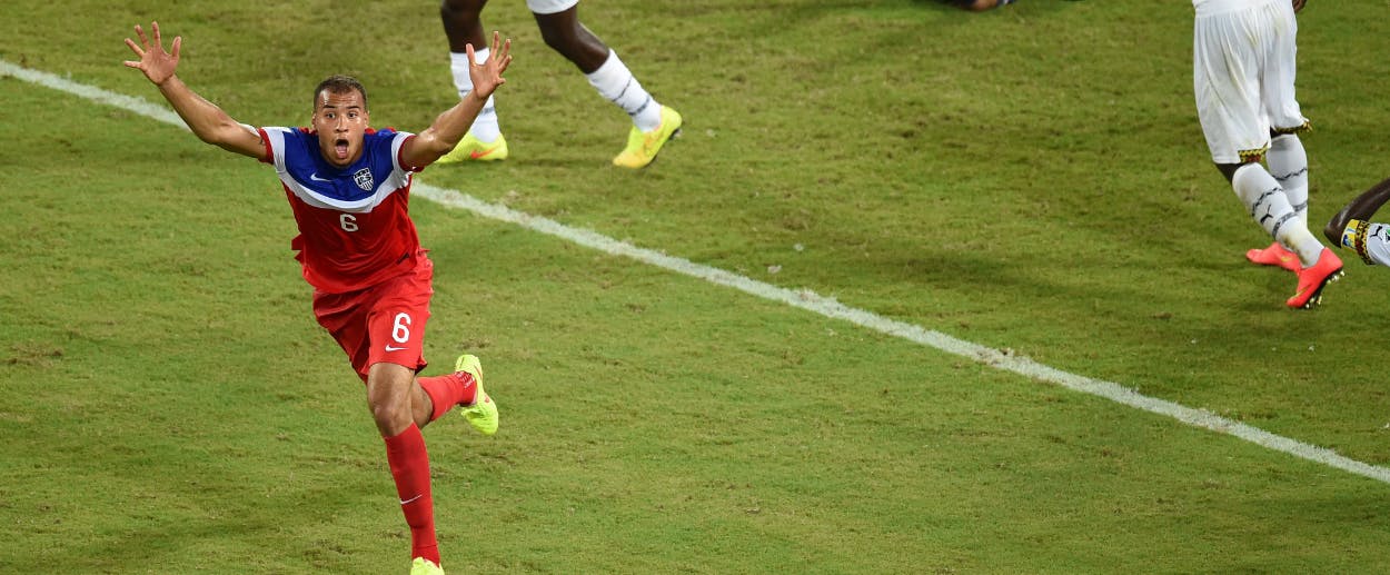 And then American supporters realized we still had to play 89 more minutes against a very good Ghanaian team, and that the referee was not just going to call the game on account of our excessive excitement. And bit by bit the American foundation started to crack. First up came the tragic injury to striker Jozy Altidore, who pulled up lame in the 21st minute while running down a ball. The pained look on his face and the somber tones from announcer Ian Darke told the story. The speculation at this point is that he’s at least done through the opening round. Then John Boye decided to get even with Clint Dempsey, and crane-kicked him in the face while they battled for a ball in the air, likely breaking his nose, and more importantly, hobbling the breathing of one of our workhorse players in humid, debilitating conditions. Then centerback Matt Besler was forced off at halftime by a twitchy hamstring, replaced by 21-year-old German import John Brooks, who many—including me, in my match preview—believed would spend this World Cup writing in his dream diary and SnapChatting.