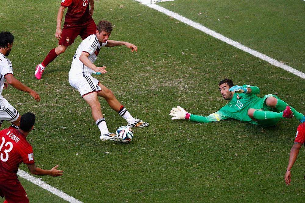 What’s most incredible about Muller’s scoring is the way he does it. Ask anyone to name the game’s great goalscorers, and the answers will invariably include Messi, Ronaldo, Ibrahimovic, even van Persie, Neymar, or Luis Suarez. Muller would never make the list. With gangly legs and his socks lolling about his ankles, he doesn’t look like a great goalscorer, and none of his goals are particularly great. Even his name, the German equivalent of “John Smith,” seems to suggest mediocrity. His two later goals against Portugal were both cases of being at the right place at the right time—which is, in fact, Muller’s specialty. Much of the time, it seems like he just stumbles across a goal, bundling the ball into the net by accident. But being in the right place at the right time takes a rare kind of vision, the ability to see the whole pitch and time runs to perfection. That is the key to Muller’s game.