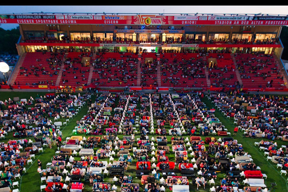 Any other day of the year, you might head to the Alte Foersterel stadium in Berlin to see a second division soccer club, 1. FC Union Berlin, play a competitive match. This summer, however, the 94 year-old stadium has been put to a different use: the club has opened its doors to the general public for the World Cup, hosting open-air screenings on the grass. Union Berlin has also decided to make the experience a little more comfortable for its viewers than most large-scale public screenings. Attendees are not only encouraged to bring themselves, but their own couches in an effort to mimic the luxury of home.