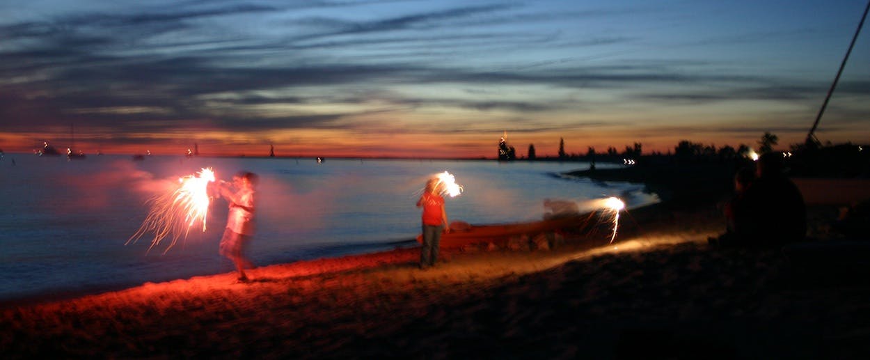 Fireworks: The sun has cooled yet everything is clear—the long sands are palest buff and the ocean greyest blue with the low waves like porcelain breaking frailest white between; the full moon, a shining buff, rises close and big. Tireless children, little blond girls and boys in pink or yellow pinafores, still slide squealing down their smooth, bumpy slides in interminable line. But now the last sandwich has been bolted, the last hard-boiled egg been peeled—the coffee is cold in the thermos bottle. They strew the sands with tissue-paper and leave the beach to the night. A shot is heard; all look up: the sky has darkened; a hiss of tinsel pierces the grey, showering violet and silver as it breaks its parabola. The deliberate reports of the mortars burst brooches of red, gold and green, falling bouquets that unfold in fresh clusters as the sprinkling flowers that gave rise to them fade—the loud detonation of a crowd of white electric stars. A scent of gunpowder singes the fresh fishy wind that bears in with the night from the sea—blowing shipboard, the dunes of Cape Cod, the hotels of Cannes out of season, sudden dark of Pacific spaces, the summer seaside of all the world. Children on the beach run down to the breaking waves, more savage and loud with the dark, and hold the brass-bristling frost-crystals of their sparklers out into the ocean and the night.