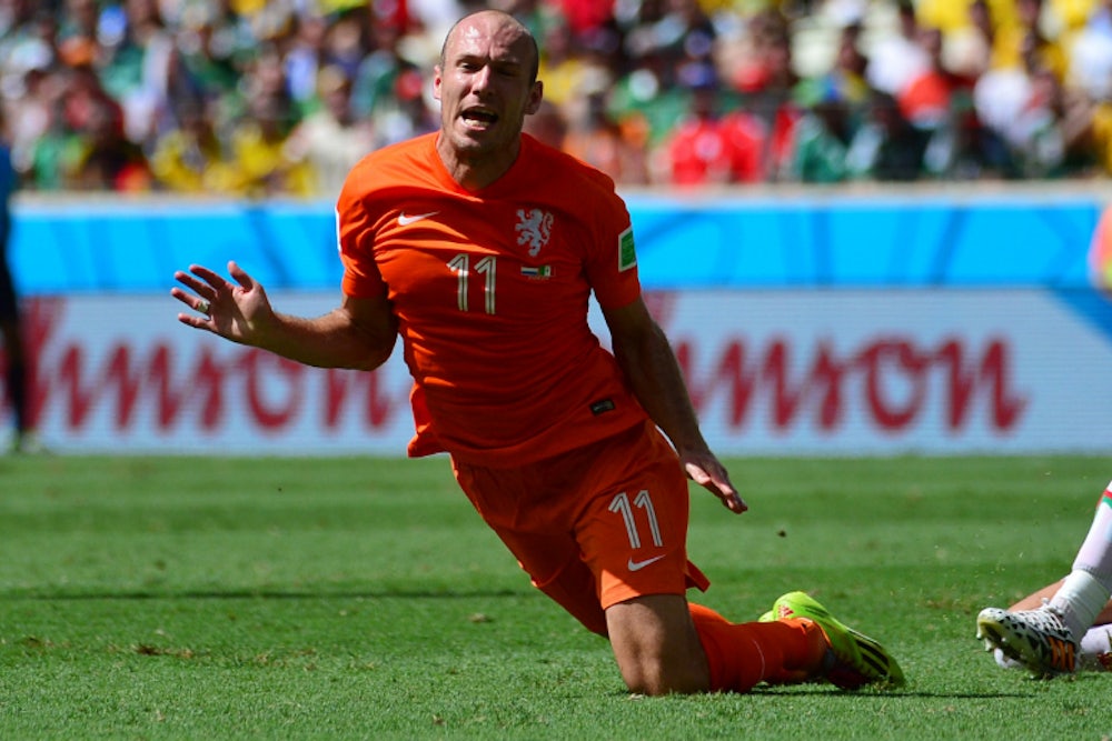 I’m not the least bit surprised that, in the midst of what has been a truly thrilling (although now slightly sputtering) World Cup, the topic of diving has managed to elbow its way in among the major talking points of the tournament. We even have our villain picked out, electric Dutch forward Arjen Robben, for falling—if not easily, then theatrically—under a challenge in the area from Mexican captain Rafa Márquez in the 90th minute of a game knotted at one goal apiece. Moments later Klaus Jan Hunterlaar took a picture perfect penalty, stinging and precise. A few half-hearted kicks of the ball remained, time ticked down. The Netherlands won 2-1. And Mexico, for the sixth World Cup in a row, was eliminated the Round of 16. The perfect penalty was instantly forgotten. The other two beautifully taken goals weren’t far behind in becoming ether, a memory that will get stirred in you someday when going over what actually happened in the game. Maybe the penalty will be your Proustian madeleine, but football exists so that you don’t have to be Proust.