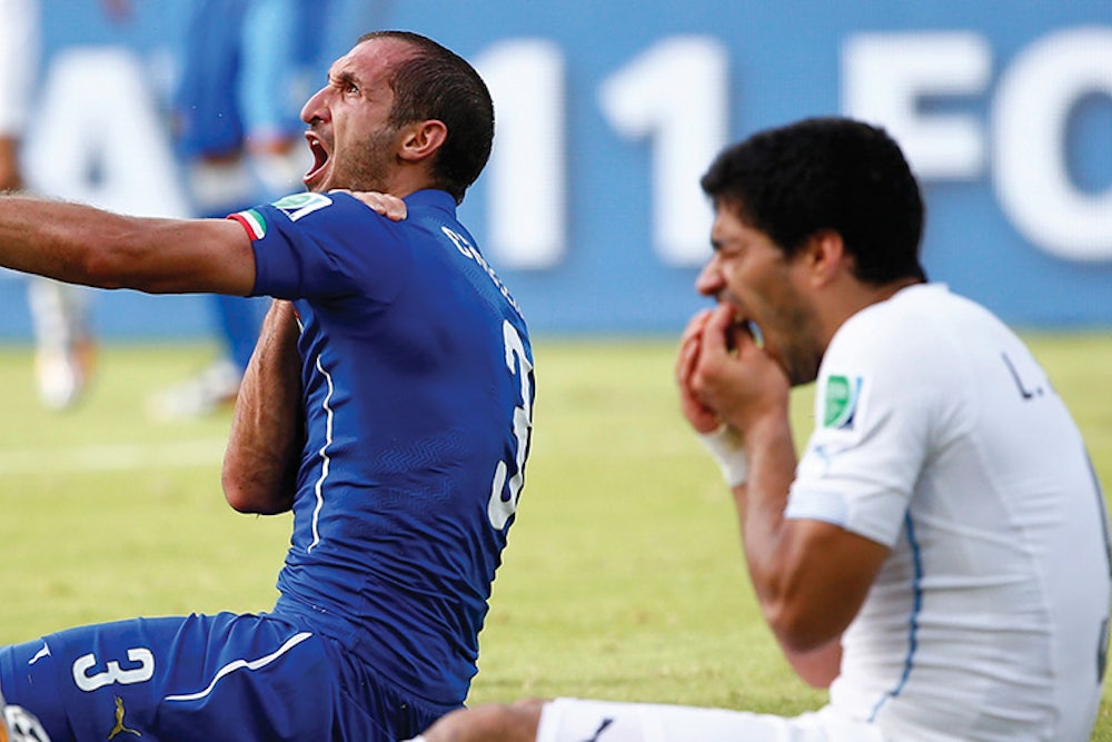 Suarez’s bite, on the other hand, was so entirely off-the-ball that it was difficult to see how he had ended up—as this photograph suggests—sitting on the ground playing air harmonica. The only clue is Chiellini’s gesture: either an appeal to the ghost of Mussolini or a version of what Joseph Brodsky calls “a mute up-yours-even-unto-the-elbow.” Given that we now know Suarez to be capable of anything, Chiellini might be claiming that the Uruguayan had, so to speak, really made a fist of it, that he was the victim of an up-mine-even-unto-the-shoulder.