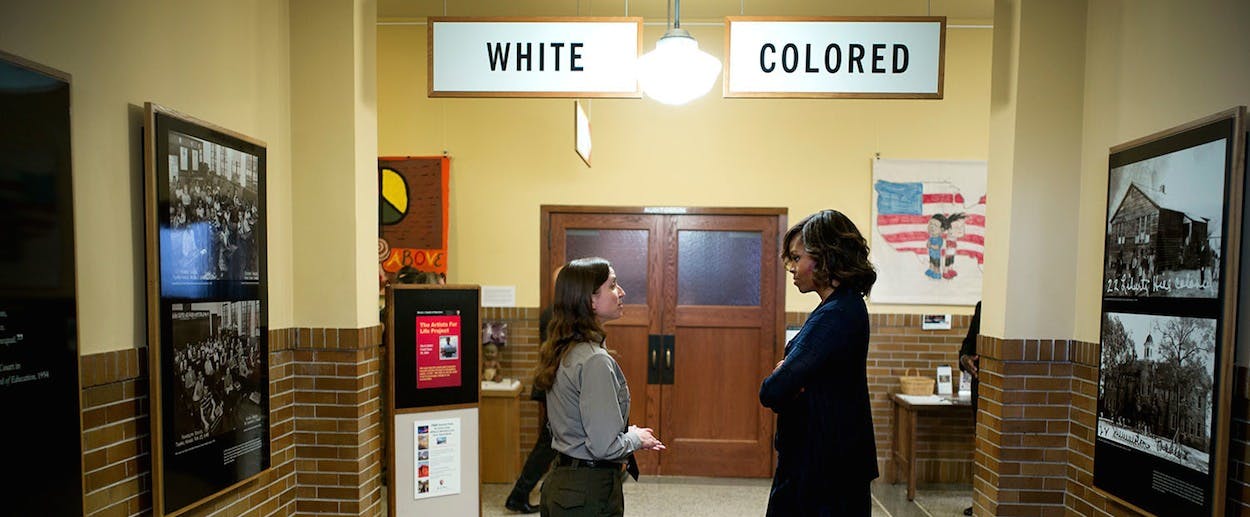 At the very least, it's the most provocative image uploaded to the White House Flickr feed in 2014. The caption for Chuck Kennedy's photo reads, "First Lady Michelle Obama tours the Brown v. Board of Education National Historic Site in Topeka, Kan., May 16, 2014. Stephanie Kyriazis, Chief of Interpretation and Education, leads the tour."