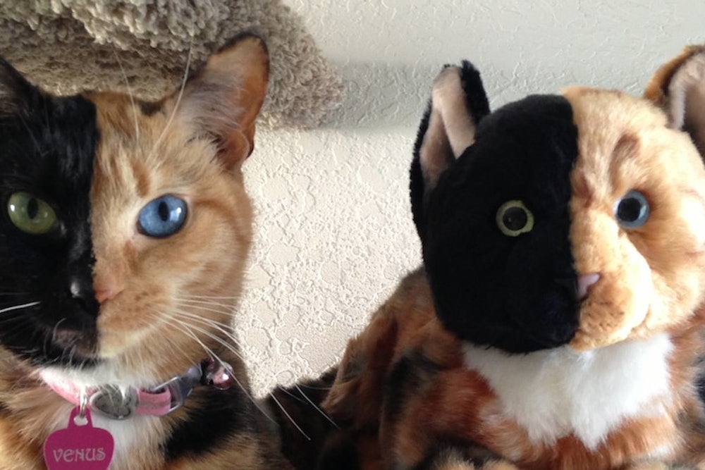 If cats rule the web, then Venus the "Chimera Cat” might be queen of the Internet. The Internet sensation's half-black, half-orange face appears to be split straight down the middle, and her eyes are striking, too: one is green, the other blue.