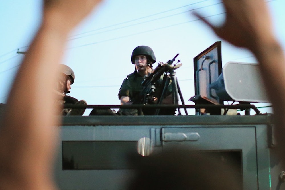 As the New York Times has reported, state and local law enforcement agencies are getting armored up from another source as well: the U.S. military. With our troops withdrawals from Iraq and Afghanistan, “the former tools of combat—M-16 rifles, grenade launchers, silencers and more—are ending up in local police departments, often with little public notice. During the Obama administration, according to Pentagon data, police departments have received tens of thousands of machine guns; nearly 200,000 ammunition magazines; thousands of pieces of camouflage and night-vision equipment; and hundreds of silencers, armored cars and aircraft.” USA Today reported Wednesday night that Ferguson is among the countless towns that received some of the nearly $450 million in military surplus distributed in 2013—most recently, two unidentified vehicles, a trailer, and a generator last November.