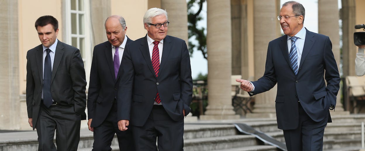 Despite increased sanctions, Russia has hardly felt ostracized by European leaders for its actions in Ukraine (as much is evident from the Russian foreign ministry’s coverage of yesterday’s talks, during which a member of the Russian delegation reportedly made “inappropriate jokes” about the situation). So it is wholly unsurprising that yesterday’s talks between the French, German, Ukrainian, and Russian foreign ministers failed to produce any semblance of an agreement with regard to the crisis in Ukraine. German Foreign Minister Frank-Walter Steinmeier had been hoping for "a roadmap toward a sustainable ceasefire,” including an agreement to stop the flow of arms and rebel fighters into Ukraine, Deutsche Welle reports. No such progress was made in Berlin. “We are not able to report on positive results on reaching a ceasefire and on [a start to] the political process [to resolve the conflict],” Russian Foreign Minister Sergei Lavrov told reporters.