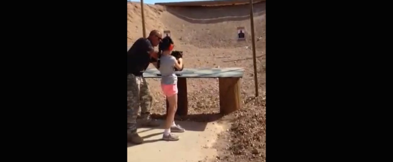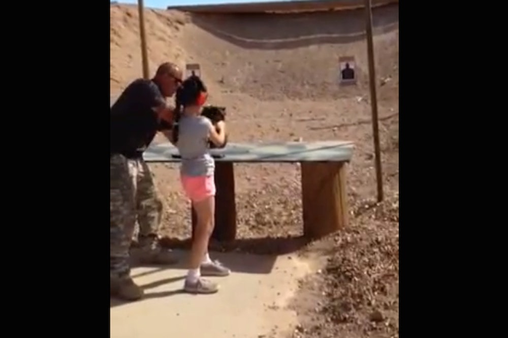 The footage comes courtesy of the Mohave County, Arizona Sheriff’s Department. The girl to his right, whose name has been withheld, is nine years old. She’s firing an Uzi—a submachine gun—with permission from her parents, who filmed the incident. It’s incredibly jarring, if you already know the backstory. But it’s also censored.
