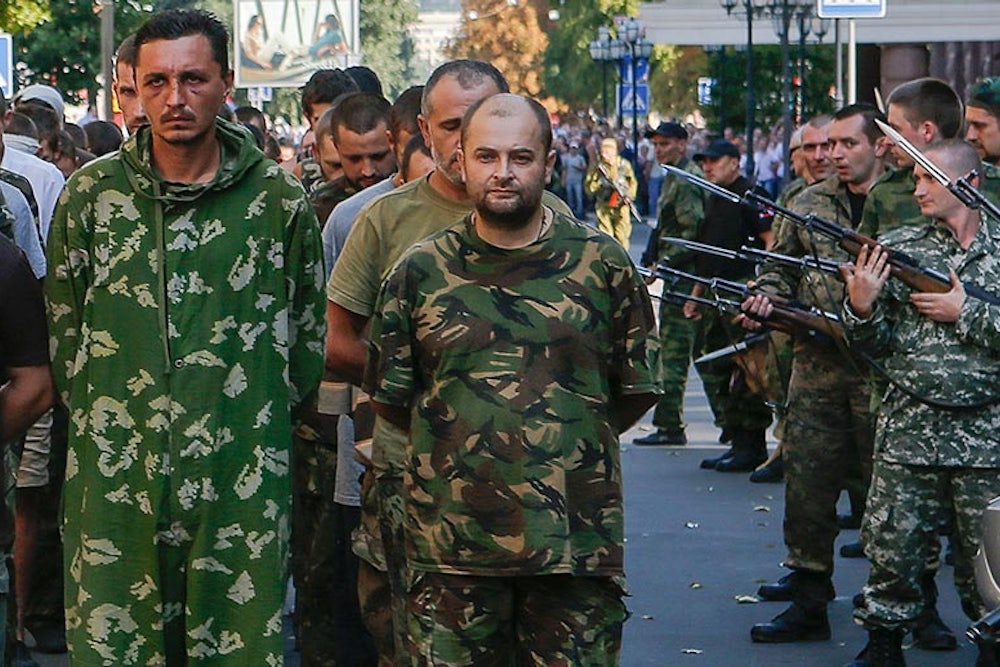 In a way, then, this latest picture from Donetsk is a lot less violent than it could be—less violent, in fact, than are many others taken in the interim. The two pictures seem to form a natural pair, though, because they show people doing what people do in cities all over the world: walking. In the first, a walk from the shops was severely disrupted by pelted eggs. In this one, the walk has become a forced march by Ukrainian prisoners of war. Where before the route was lined by loutish civilians, now it is lined by uniformed pro-Russian separatists with rifles and bayonets. The situation has evidently deteriorated, but both prisoners and guards look like they could have starred in the earlier picture, to which this one is a kind of sequel. All that was needed was a change of costume. It’s easier to imagine the captors toiling away in butchers’ shops or garages than as combat Marines. Still, even they have the physiques of SEALs compared with the prisoner on the left, who looks like he barely had time, before pulling on his boots and fatigues, to clear up the empties and shut the bar he’d been running for 30 years. It’s the tall prisoner in the middle, however, who cuts the most abject figure. That camouflaged one-piece sniper outfit—or whatever it’s supposed to be—might have looked alluringly tough in the ads in Soldier of Fortune. Here, it turns him into a lanky toddler in a romper suit that is still several sizes too large.