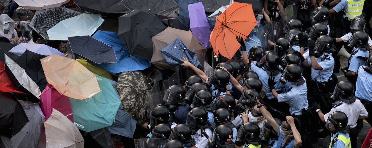 The conventional wisdom after the Sunday night clashes was that the movement had lost momentum. But my conversations with protestors on Monday suggested the opposite. Many of the people I spoke with didn’t come out until after the police cracked down. Henry Wong, 19, a student at Chinese University of Hong Kong, decided to join after seeing a live broadcast of students fighting with police. “I’m here so I can sleep at night,” he told me. Michelle Chan, 18, also said she was galvanized by the use of force: “Police don’t have to be that cruel.” Tony Wong, 24, said he was skipping work to come to the protest. I asked if his boss would be upset. “I can get another job,” he said. “I can’t get another Hong Kong.”