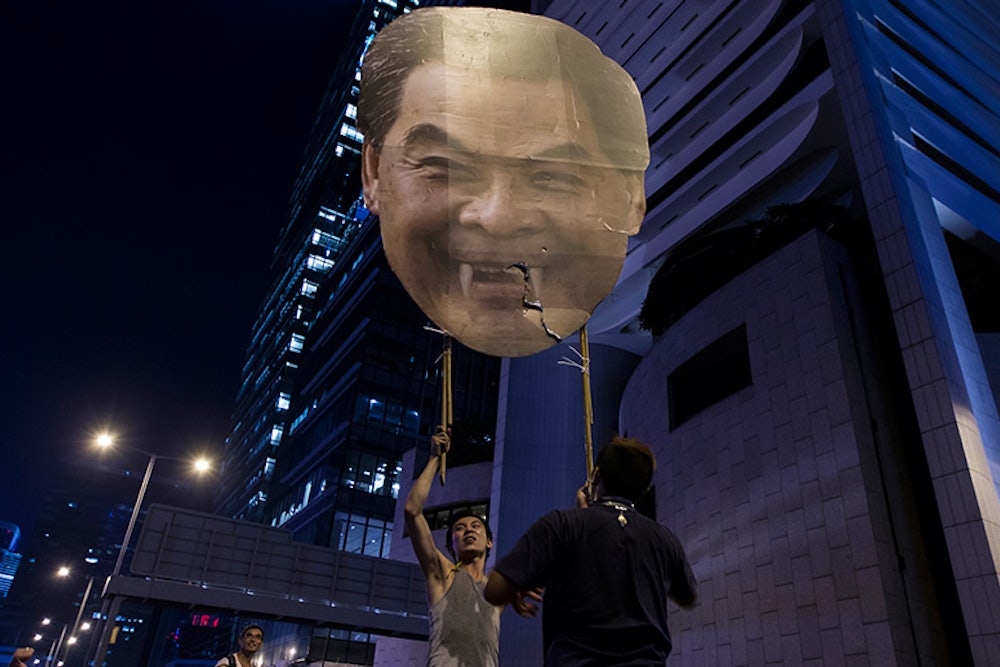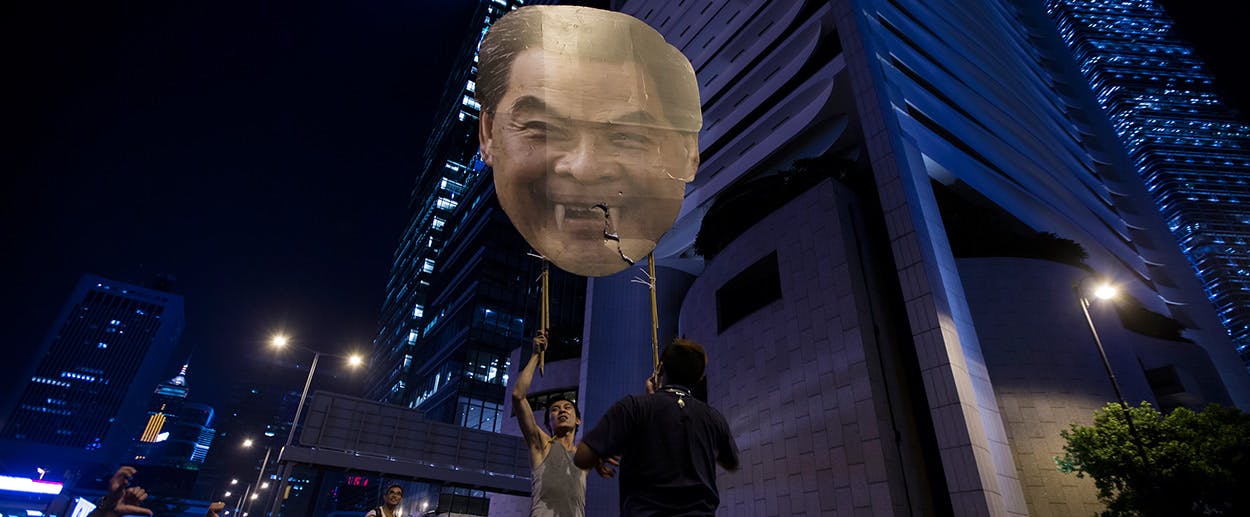 Protesters carry a defaced cutout of Hong Kong Chief Executive Leung Chun-ying, as they protest near the central government offices in the business district, September 29, 2014.