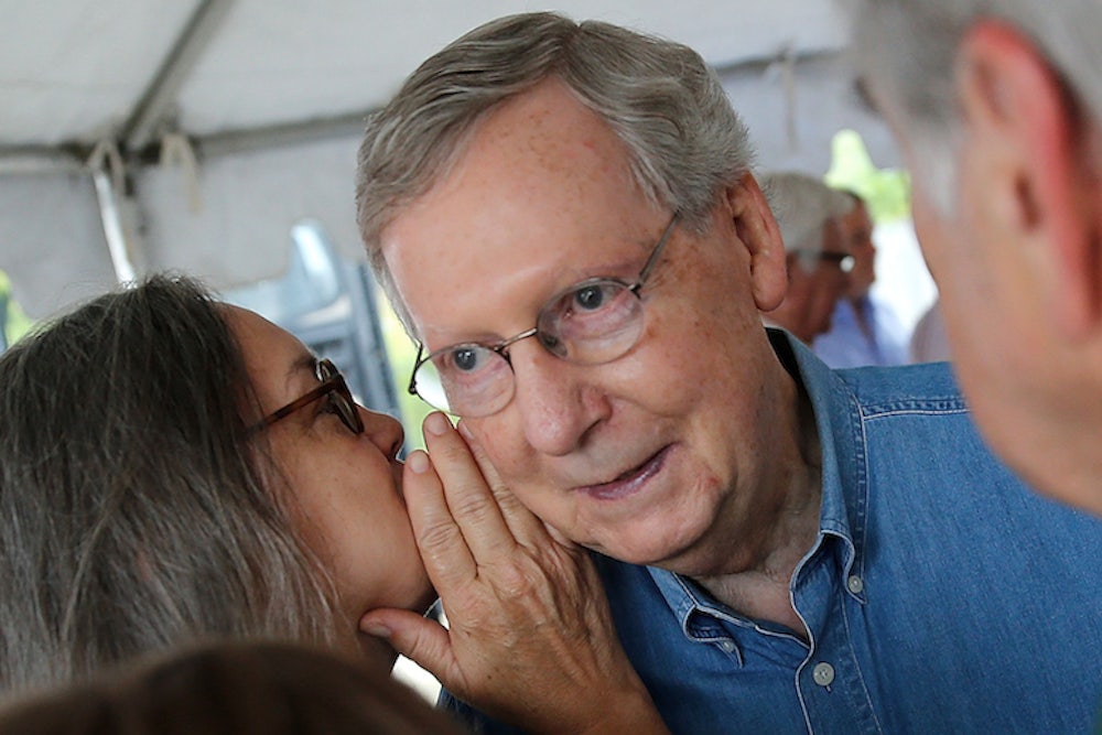 That’s why the timing of the Bluegrass Poll is so important. It comes just a few days after McConnell repeated many of the same canards in front of the editors of the Cincinnati Enquirer—who didn’t quite seem to know how to press the issue. Next week, Grimes will meet with the same editorial board, and face off with McConnell in their sanctioned debate. These will effectively be the last two opportunities she has to lay the preposterousness of McConnell’s claims bare—to run against him not just as an unpopular, out-of-touch old guy, but as someone who isn’t actually on the level. Except, she won’t be able to do that if she keeps cowering from the issue.
