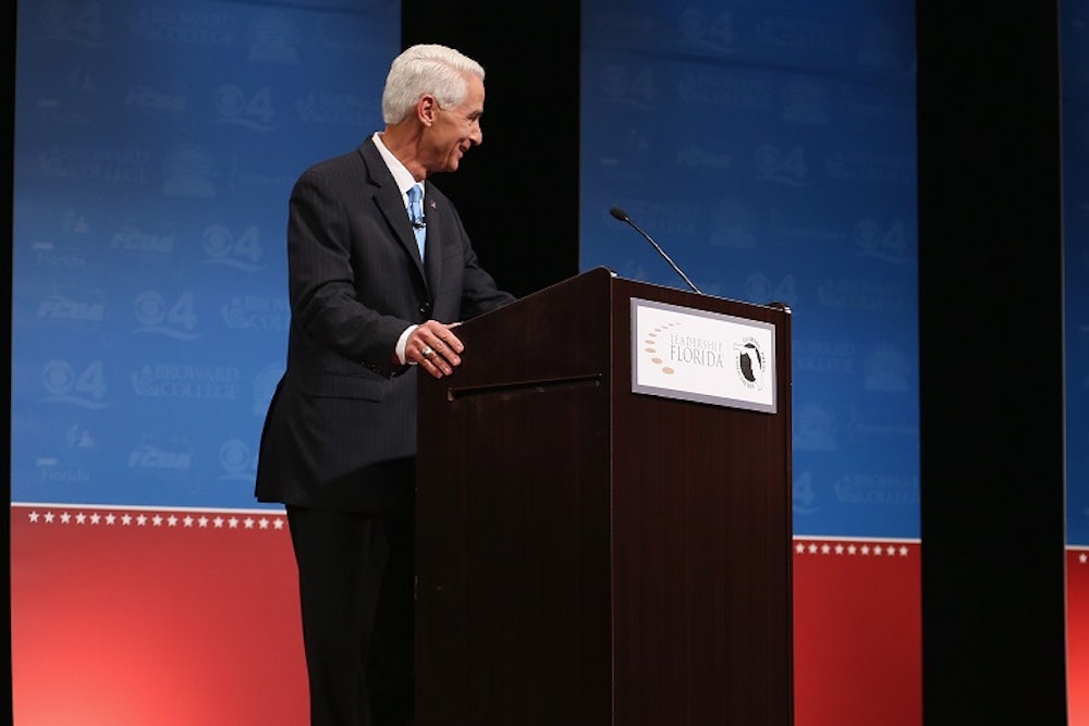 Scott also struggled to answer questions about whether Florida’s ban on same-sex marriage is discriminatory. He said he opposes discrimination, he blamed Crist for passing a constitutional amendment against same-sex marriage when he was governor, he said he would abide by any court’s ruling, and he argued that there shouldn’t be any “ill will” between people on opposite sides of this debate. What Scott wouldn’t do is answer the question—and the moderator noticed. She cut in and asked him again whether Florida’s ban on same-sex marriage is discriminatory. Again, he filibustered. “I don’t believe in discrimination,” he said again, as the crowd groaned. “… I believe in traditional marriage. The court is going to decide. This is a decision for the courts and ultimately they will make the decision.”