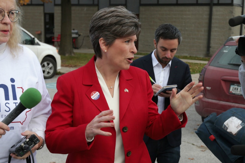 And these aren't just one-off comments, either. Ernst holds a long list of established positions that would seem like a tough sell with many voters in Iowa. She is critical of the existing social safety net—she has spoken in favor of privatizing Social Security and waxed nostalgic about the time, before food stamps, when “wonderful food pantries” took care of the poor. She is opposed to a federal minimum wage and has said that $7.25 an hour suffices for Iowans. She has sponsored “personhood” legislation that would have amended the state constitution to legally define someone as a “person” at conception, and said at a GOP primary debate this spring that if such a bill passes, abortion providers “should be punished.”