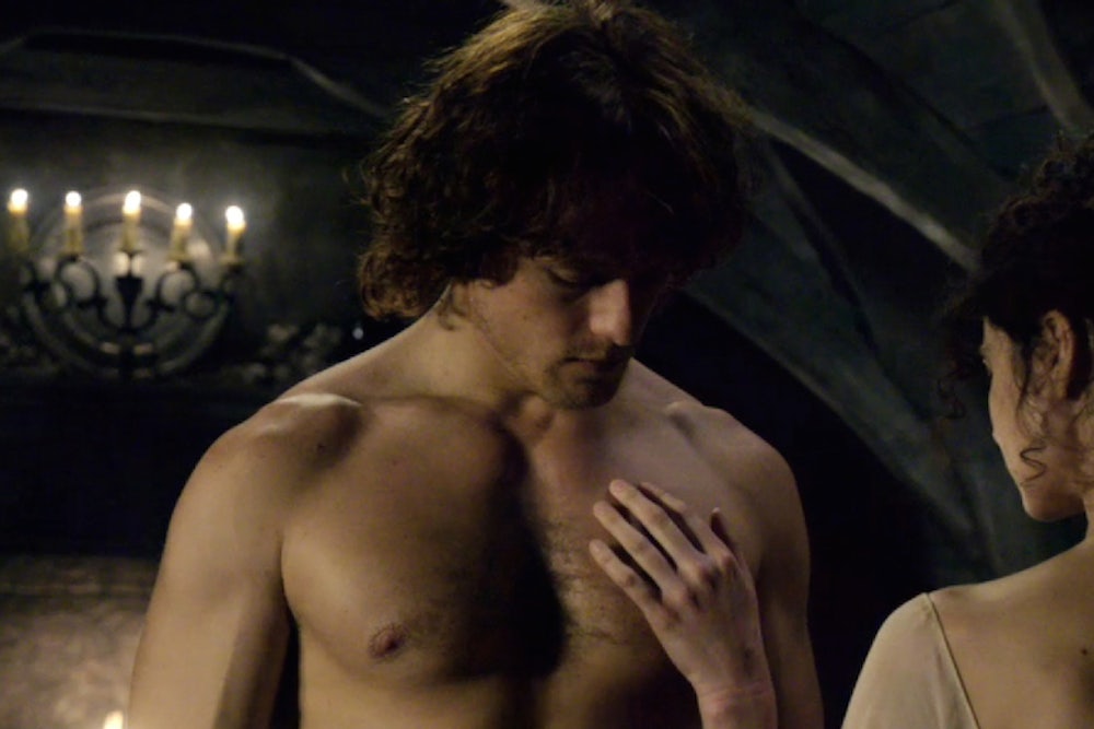 But then! After six episodes of chaste foreplay, “Outlander” finally aired “Wedding,” marrying Claire (Caitriona Balfe) off to hunky highlander Jamie (Sam Heughan) and showing us the entire wedding night. The scenario itself was unusual for TV: Claire, who has a husband back in the 1940s, is confident and experienced; Jamie is the timid virgin. The sex is awkward, honest, and heated. “Jamie, you’re crushing me,” she tells him at first. At one point, she asks him to take off his shirt: “I want to look at you.” She slowly circles his body, and so does the camera, lingering on sinewy muscles and soft flesh. After a few silent moments, she reciprocates. Unlike in “Orphan Black” and “Game of Thrones,” Claire’s desire isn’t part of a power play. It’s something much gentler, part of two people getting to know each other, bodies included.