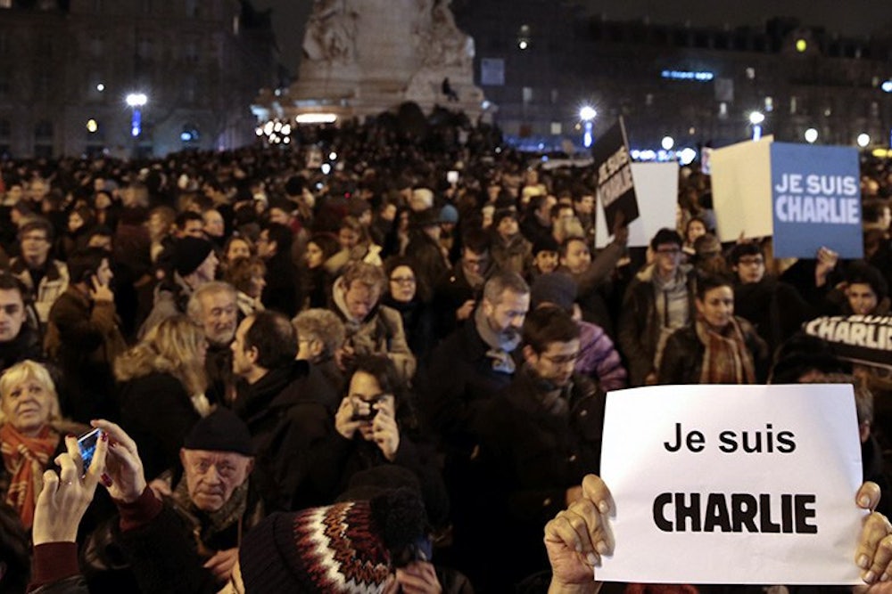 This was appropriate since the issues involved were more complex than the global expression of solidarity—Je Suis Charlie—could convey. In the absence of a picture, however, this irritating slogan whooshed into the vacuum so that the words— i.e. photographs of the badges, banners and stickers printed with the words, or of monuments with the words projected onto them—became the picture. This, too, was appropriate since Charlie Hebdo was a puerile magazine that ended up punching way above its weight. Judged purely aesthetically, the monuments of Paris looked far better with Nazi flags flying from them than they do with Je Suis Charlie lit up on them. Is that offensive? Not to me it’s not, Charlie. And don’t forget: Vous n’êtes pas Charlie seulement quand ça vous convient le mieux!