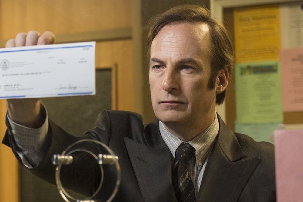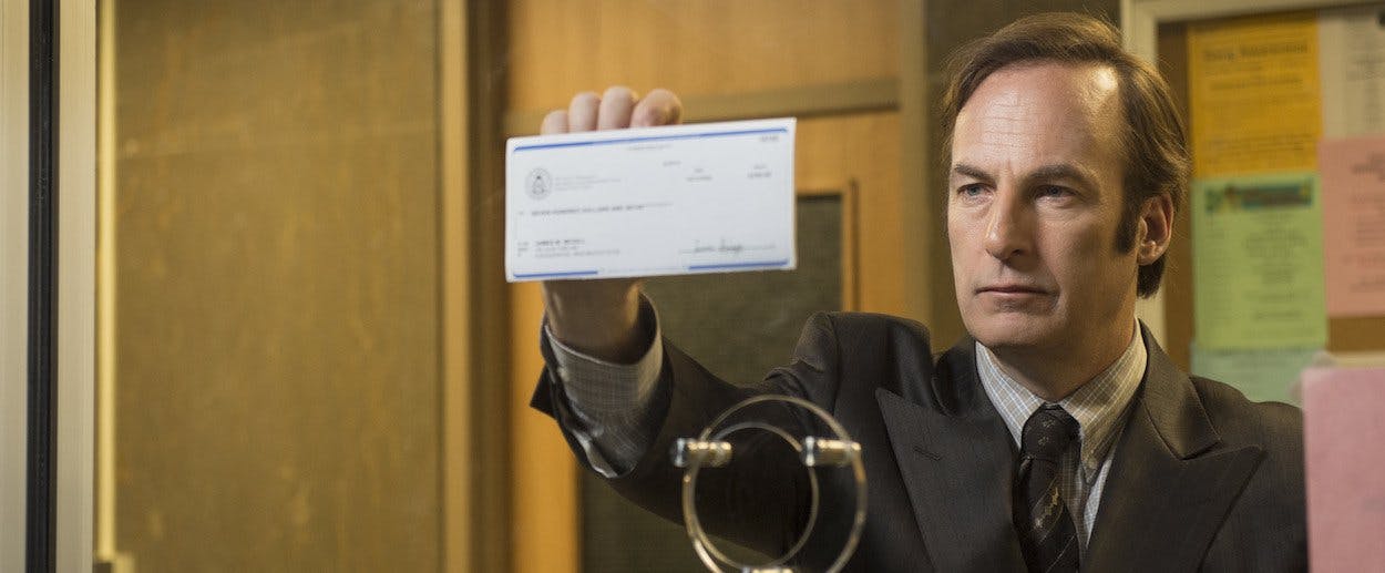 Saul Goodman burst into “Breaking Bad”’s second season fully formed, a sweaty shyster in a strip mall, a criminal lawyer with a motor-mouth that could save his life and a conscience up for sale. Over the next three years, we didn’t learn that much more about him; as Walter White descended to deeper levels of moral monstrosity and Jesse Pinkman tortured himself with guilt, Bob Odenkirk’s flamboyant lawyer remained largely the same: a lovable sleaze with fake hair and a fake name. (“The Jew thing I do for the homeboys,” he tells Walt in his first appearance. “They all want a pipe-hitting member of the tribe, so to speak.”)