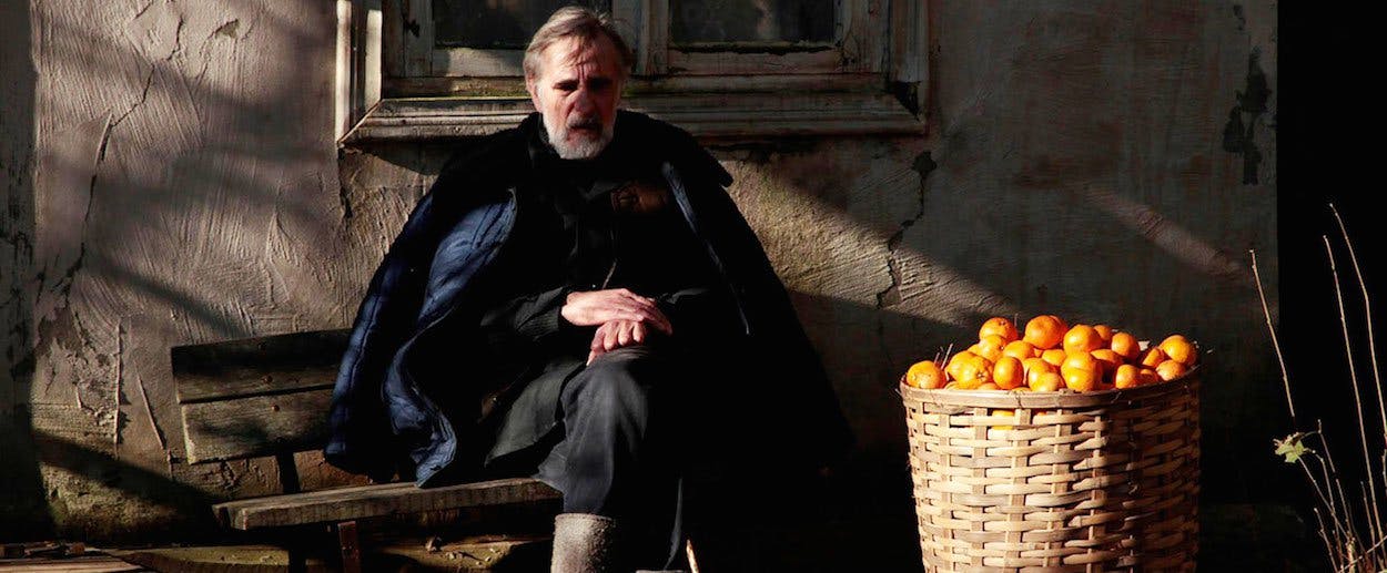 This is how a quiet war film asks you to hush and to listen. It's a theme of Tangerines (Mandariinid), in fact, to subvert the thrum and blast of what war movies have trained us to expect. Ivo (Lembit Ulfsak) and his neighbor, a tangerine farmer named Margus (Elmo Nüganen), are some of the last holdouts in Abkhazia, Georgia during a war between Georgian forces and Abkhazian separatists in the aftermath of the USSR's breakup. Their friends and family, ethnic Estonians, have fled to Estonia (not particularly handy, geographically). Aside from the ominous echo of faraway gunfire, and brief encounters with passing soldiers, all is sleepy-still.