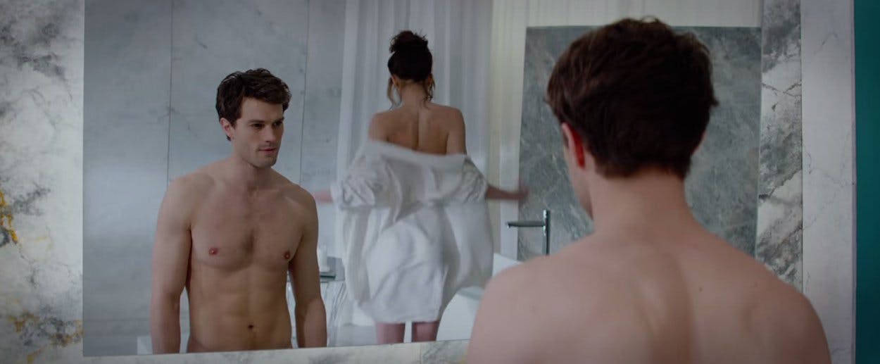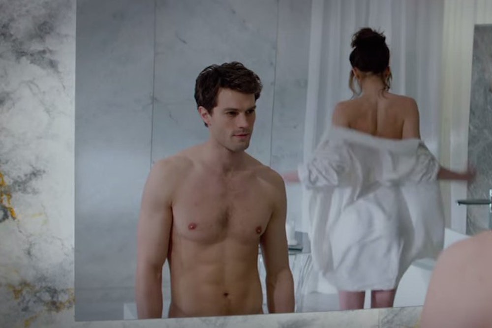 Heather Havrilesky at The Baffler and Arthur Chu at The Daily Beast have already pointed out that Fifty Shades is, among other types of porn, a kind of lifestyle porn. Havrilesky notes that the novels are rife with obsessively detailed scene-setting when it comes to Christian Grey and Anastasia Steele’s luxe surroundings, and Chu duly remarks that branding is heavily present in the film, with no sparkly token or sleek possession going untagged. You could briefly doze and miss the film’s eroticism, but it’s impossible to miss the visual markers of wealth: private helicopter jaunts, spacious offices, finely tailored suits, ritzy cars and top-of-the-line tech. Even the film’s trailer tracks Steele’s erotic journey into BDSM with her vertiginous rise in class, scenes of sexual domination interspersed with scenes of conspicuous prestige blurring into cuts of Steele literally rising higher, first in an elevator, then in helicopters and planes.