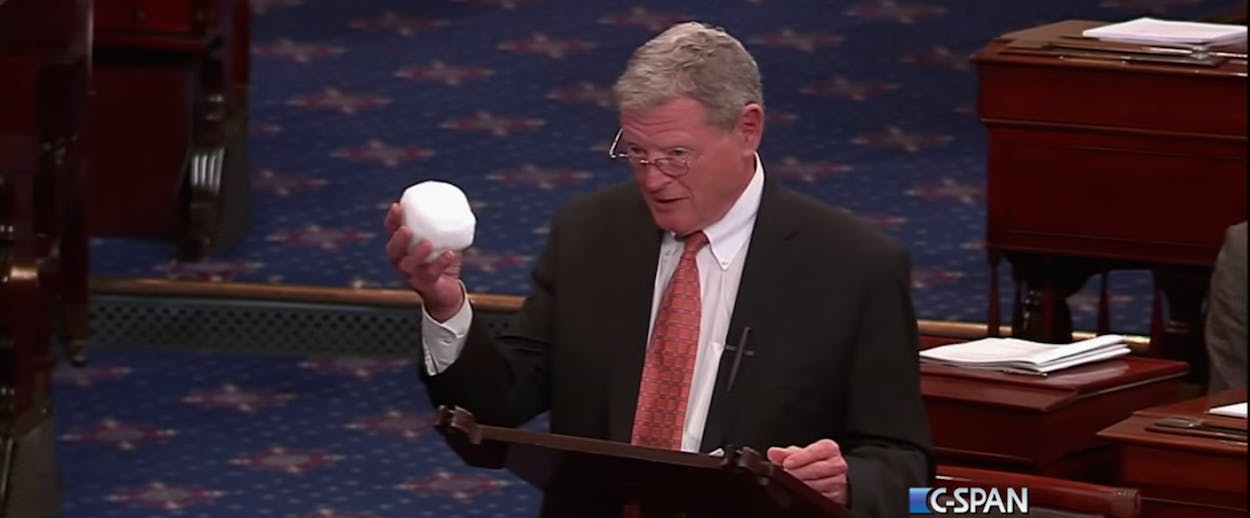 Last Thursday, Republican James Inhofe, the chairman of the Senate Environmental and Public Works Committee, held a snowball on the Senate floor to prove that it is cold outside in Washington, D.C. Inhofe took that to mean climate change science is "hysteria," because global warming can't be real. "We hear the perpetual headline that 2014 has been the warmest year on record, but now the script has flipped," he said. The stunt itself lasted under 15 seconds, but was covered by the media for days. It even inspired a parody Twitter account, @InhofesSnowBall.