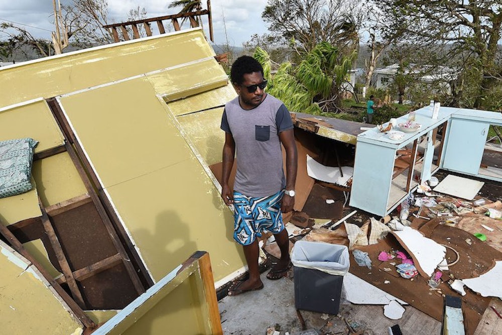 Over the weekend, Cyclone Pam—a category 5 storm—slammed into the small Pacific island nation of Vanuatu. The storm flattened homes and hospitals across the 82-island archipelago, which has a population of just 267,000 people. One UNICEF worker said that the area looked like it was “hit by a bomb”; it’s been estimated that 90 percent of the buildings and homes in Vanuatu’s capital were destroyed.