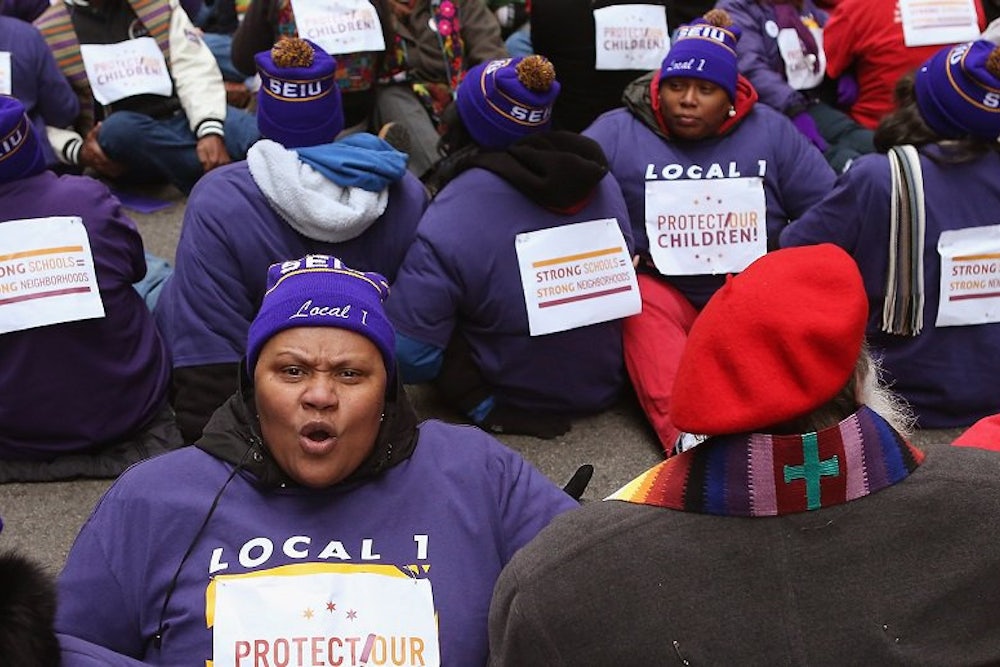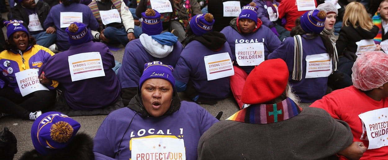 Tara Stamps, a rank-and-file member of the teachers union at the time, proved to be a fiery orator on the picket line and at huge demonstrations downtown. Her mother, the late Marion Stamps, was a bullhorn of a woman who operated a community center at Cabrini-Green, started an Afro-centric alternative school, and dragged her five daughters to every protest and meeting that she ended up throwing into chaos. Tara recalls standing atop the Illinois governor’s desk as a young girl, stomping on crackers. “We were direct action,” she laughed. At her middle school, she led other students on a boycott of the lousy cafeteria food. “I get my leadership philosophy from my mother," she said. "You sometimes have to say inflammatory things to shock people into paying attention to racist practices.” She saw the teachers’ fight as one of civil rights, involving access and Americanness. “If charter schools are our best hope, why aren’t they in white neighborhoods? I’m so tired of black folks being part of the white man’s experiment, I can’t see straight.”