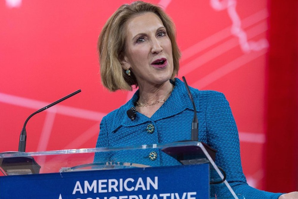 Though she’s committed fewer blunders than Palin, Fiorina does have some obvious similarities to the former vice-presidential candidate. Both favor words like “outsider” and “tough,” and allow themselves to be cast as a woman who does it all: They’re breadwinner moms with business savvy and enough charisma to make their raw ambition palatable. Similarly, both women’s careers have been marred by major professional failures: Fiorina’s firing from Hewlett-Packard and Palin’s "bridge to nowhere" (which, ironically, Fiorina initially defended).