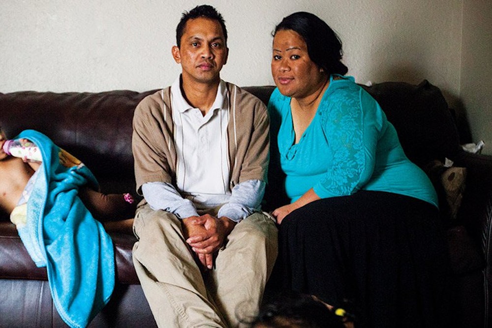 Dexter got a job at George’s, a local chicken-processing plant, making around minimum wage; they found an apartment and settled in among the Marshallese community. In 2011, Dexter took a job at a Butterball turkey plant, where the wages and benefits were slightly better, but the couple still struggled to pay the $450 monthly rent. Leading up to Thanksgiving, the work was steady, as the plant churned out around 45,000 birds per day. But for the rest of the year, Dexter often failed to get enough hours. Their family was starting to grow—in addition to Maryann’s son, the couple had two new daughters—and some months they could barely pay their bills. Maryann wanted to get a job, but they couldn’t afford a babysitter. They pinned their hopes on a tax refund that might let them buy a ticket to fly Maryann’s sister over from the Islands so she could watch the kids.