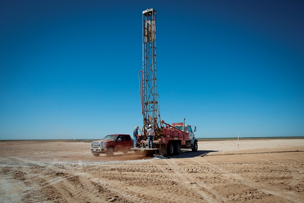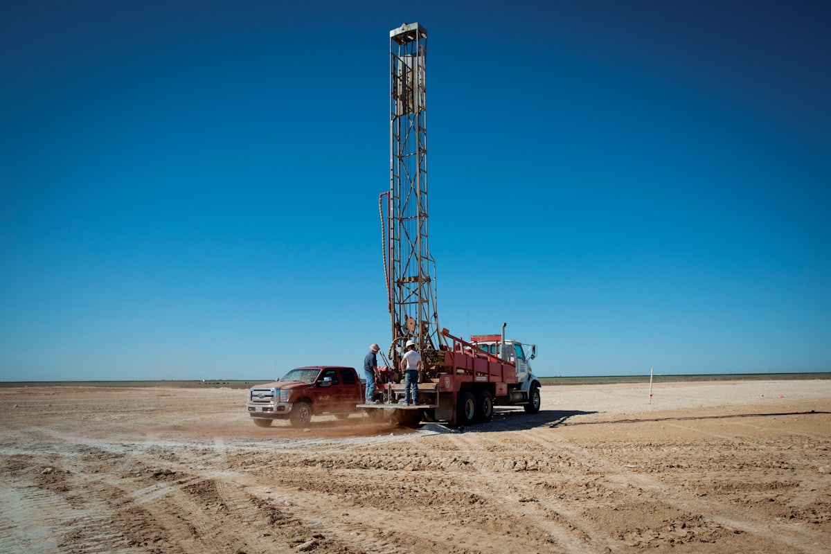 On the narrow platform of their drill rig, Ken Grant and one of his workers from Hi-Plains Drilling sent up varicolored plumes of dust and sand as the rotary bit moved deeper in the ground. Each length of pipe buzzed through the substrata, and then Grant would hoist another on the mast, attach it, and keep drilling. He wore a full brim hardhat and UV shades against the unrelenting sun. His salt-and-pepper Hulk Hogan-meets-biker mustache was caked with red dirt. Grant was sinking a test well to determine if the Ogallala Aquifer was completely dry in this area east of Lockney. When dug, the actual well, which was located just on the other side of Grant’s truck-mounted rig, would go all the way to the Santa Rosa Formation, a part of the brackish Dockum Aquifer system that underlies the Ogallala by another 400 feet. “It’s eight hundred fifty feet to water here,” Grant said. Regulation requires pouring a concrete case around the pipe to prevent contaminating the freshwater Ogallala with saline water from the Santa Rosa, but with the Ogallala now completely dry in this region, there was no need.