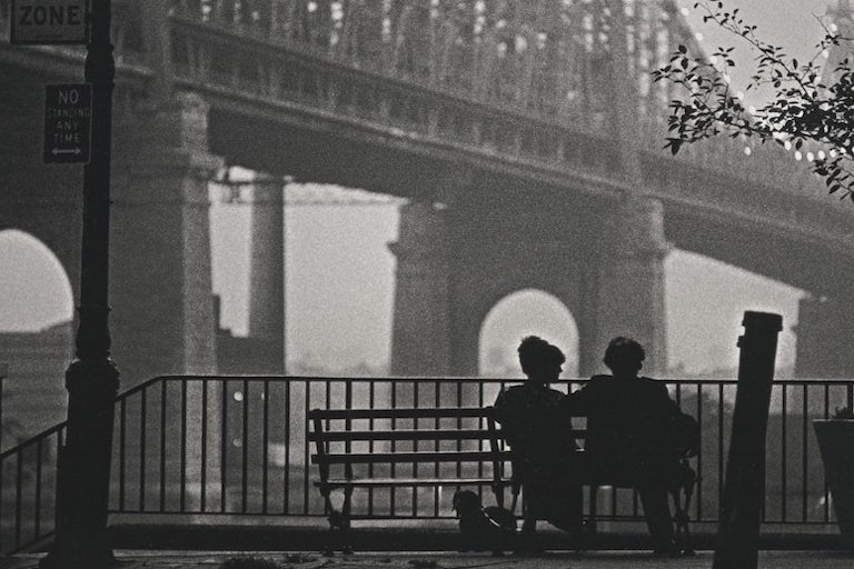 We glance up at our screens, where Woody Allen and Diane Keaton share a bench in the Manhattan twilight, the lights of the Queensboro Bridge glowing in the distance. Taking in the glorious view of the East River, he tells her, “This is really a great city. I don’t care what anybody says.” We stumble off the bus and onto the street, past a woman frenziedly emptying the contents of her purse into a garbage can, and mill around, taking photos of the bridge and the glass-and-steel residential towers of Roosevelt Island.