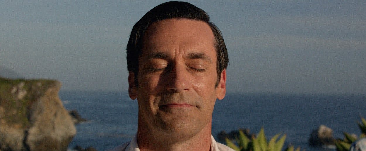 That line from the pilot was what I kept coming back to after the final moments of “Mad Men” last night: Don sitting cross-legged on a verdant cliff, chanting “Om” and smiling before suddenly, and ironically, giving way to the wholesome gongs of “I’d Like to Buy The World a Coke.”