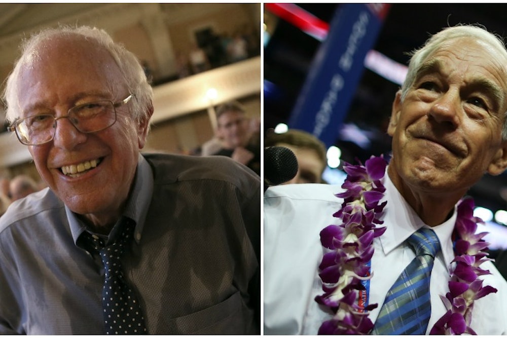 Ever since Bernie Sanders, the independent senator from Vermont, announced that he would seek the Democratic nomination for president, he has drawn comparisons to a similarly disheveled, longtime politician with a cult-like following and a strong independent streak: former Congressman Ron Paul, who ran for the Republican nomination in 2008 and 2012. It’s true that Sanders and Paul have a lot in common: They both have rabid fan bases, don’t hold their tongues, and embrace ideologies that are rejected by the establishment of their respective parties. And like Paul, Sanders could challenge his party’s frontrunner early on, but doesn't stand much of a chance of winning the nomination. As Slate’s Jamelle Bouie wrote this week: