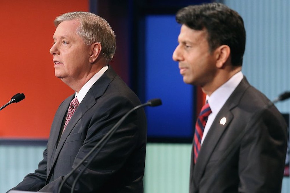 Only two candidates, Senator Lindsey Graham and George Pataki, in the second-tier Republican presidential debate on Thursday have accepted that climate change is real and man-made. That doesn't necessarily mean they support policies to mitigate the problem, and Graham even managed to use a question about climate change to push his hawkish foreign policy.