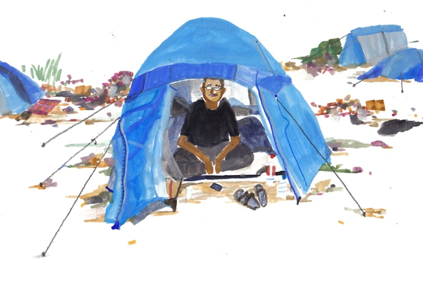 There is a hotel, a school, shops, a chicken restaurant, a bicycle repair area, a church, a mosque, and four “embassies,” which are big tents with the names of countries written on them. The Afghan owner of the chicken shop, incidentally, snores.