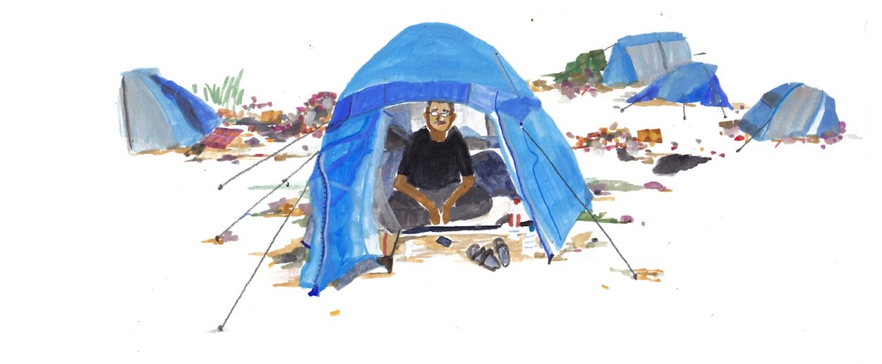 I arrive at the Jungle early in the morning. There is a tall man in a muscle tee bullying the migrants. He is putting his finger into the chest of a skinny Sudanese guy. “Two-thousand pounds, mate! Two-thousand pounds!” I assume this man is a smuggler. I go the other way. Later, he steals cigarettes from an Afghan man’s store.
