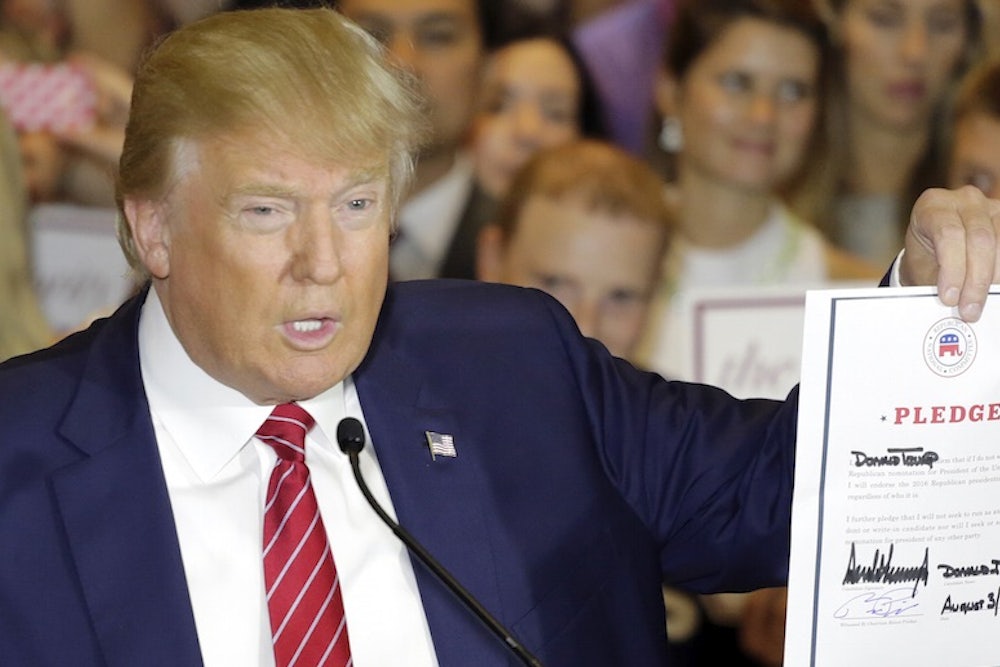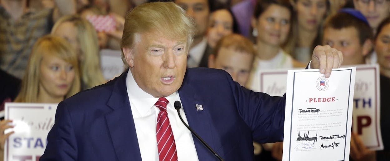On Thursday, Donald Trump signed a loyalty pledge to the Republican Party, stipulating that he would support whoever becomes the GOP's presidential nominee and foreclose the option of mounting an independent or write-in or third-party candidacy. The purpose of the pledge was to bring Trump to heel. By announcing his decision publicly, and holding the signed pledge up to a thousand cameras, Trump gave the Republican party readymade and provocative attack ad material: In the event that he shirks the agreement, and mounts an independent candidacy at some point, Republicans can air footage that proves Trump broke his word.