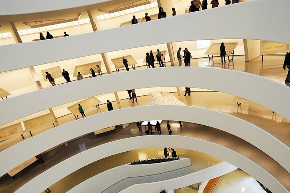 It is already clear how the form of Wright’s building discharges the function of displaying pictures for exhibition. The great spiral is the only arrangement I’ve ever seen that lets you walk through an exhibition with no involuntary doubling back. But the building does something else, too, that is probably as important as the machine for-looking-at-pictures: it gives you the sheer elation that comes from looking at, being in and moving through large amounts of enclosed space. Although we stand as verticals on the horizontal earth, space enclosed by curved planes brings us more elation than space enclosed by vertical and horizontal planes. In this quality Wright’s Guggenheim is more closely related to its neighbor, the Metropolitan, and to the National Gallery in Washington, than to the Museum of Modern Art or the Whitney.