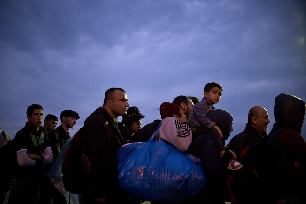 A woman holds her child on her shoulders at Tovarnik railway station as migrants wait to travel to Serbia from Croatia. Tovarnik has been the site of stampedes and clashes with police in response to overcrowding. According to the Guardian, the station is only 12 kilometers from a minefield “left over” from the Yugoslav Wars.