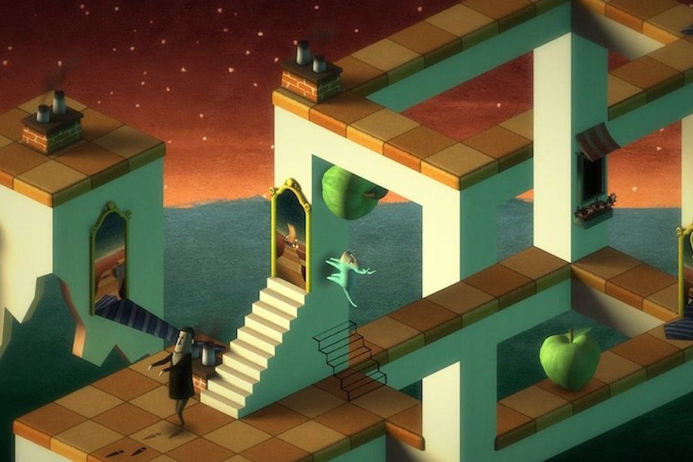 It’s the work of Dutch graphic artist M. C. Escher that has provided the most substantial stimulus for game designers. His impossible, perspective-fudging structures have provided a design template for numerous video games (Escher is the only artist I know of who has a Wikipedia page dedicated to video games inspired by his work). In the 2008 puzzle game Echochrome, for example, players must direct a marching mannequin toward an exit door by spinning a 3D, rotatable world. Here the mechanics of physics are directed not by the usual logic of gravity and positioning, but by one’s current perspective on the scene. Change perspective and you alter how the mannequin is able to navigate the world; optical illusion is, as in Escher’s drawings, treated as physical reality. It’s a trick repeated to tremendous commercial success by Monument Valley, a handsome iPhone game released in 2014 that had made its London-based creators more than $6 million. (The game was even featured as a minor plot point in the most recent series of House of Cards).