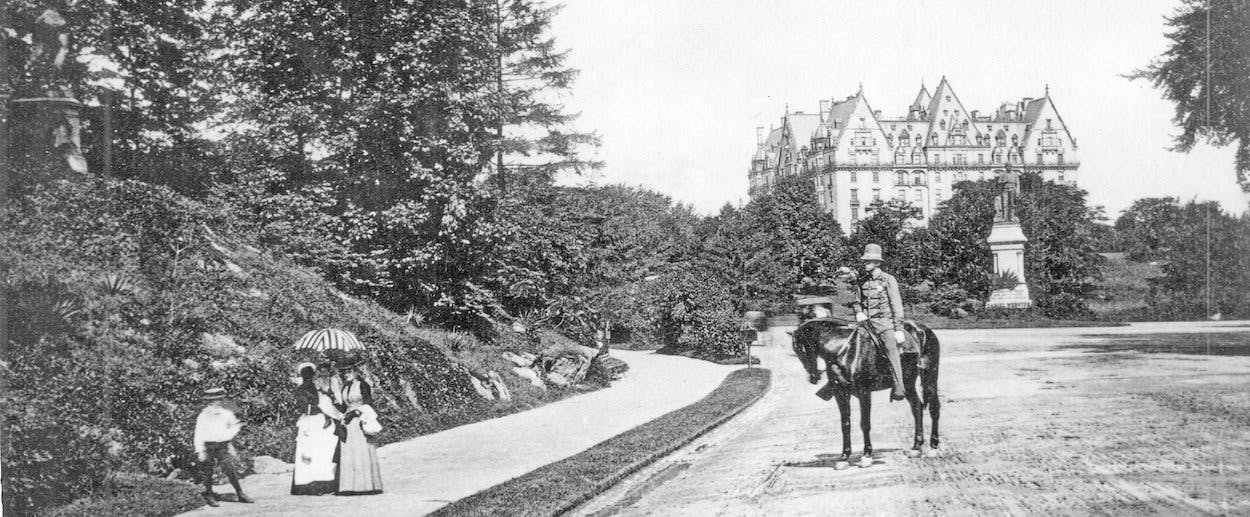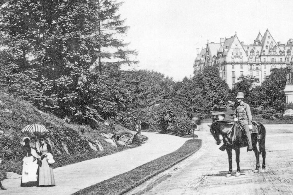 The Dakota, said to have been named so because it was originally so far north and west that it may as well have been in frontier territory, was built between 1880 and 1884. It was designed by Henry Janeway Hardenbergh—who went on to build the Waldorf Astoria, and Plaza Hotels as well as the Con-Ed building—and financed by Edward C. Clark, a businessman who made his fortune in the Singer Sewing Machine Company. At the time of the building’s completion, the Upper West Side was largely barren plots of granite separated by marshes and wandering goats. An 1889 issue of Frank Leslie’s Illustrated Newspaper describes the Dakota as a “great overshadowing mass of brick and stone” which rises against “the humble cottage that was built upon the plot when it was all a part of a garden or farm.” Alpern knows that, no matter how often we see it, we are still shocked to see that a little over a century ago Manhattan as we know it is unrecognizable.
