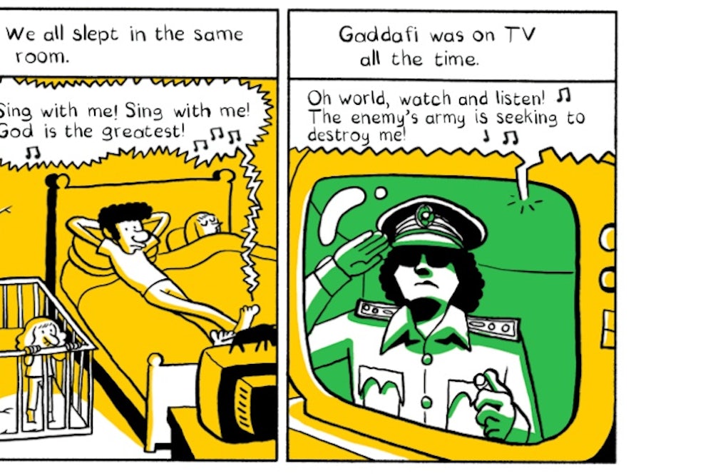 Equipped with an outsider’s eye wherever they end up, young Riad recounts his experience of Libya as a closed society that is a phantasmagoria of deprivation and ineptitude. Private property is banned, and all doors lock from the inside. As soon as the family leaves their university-provided housing for a stroll squatters swoop in. There are constant food shortages, too. Much to a toddler’s delight, they subsist at times on bananas alone. The entire society seems to operate on the whims of the larger than life Supreme Leader whose portrait is plastered everywhere and whose grand manifesto, The Green Book, Abdel-Razak now dutifully reads. Yet of all things, what bothers him most is Qaddafi’s pan-African support for blacks. An unprincipled bigot, Abdel-Razak is also a hypocrite—we recall it was Clémentine’s black friend who first caught his eye. This is the first of many subtle moments in the book when Riad eviscerates his father, who doesn’t even have the integrity to be mean. Though there can be a tenderness to his depiction—Abdel-Razak is not genuinely bad so much as impotent, his insecurity in turn leading him to habits of low-grade cruelty one can imagine he might rise above were circumstances otherwise, were there access to healthy self-esteem—it is a portrait of a man that only grows less flattering with time.