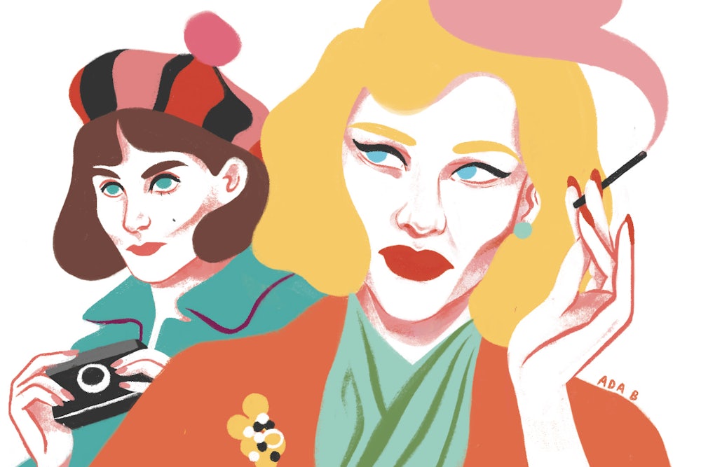 His new movie, Carol, continues in this signature vein. Based on Patricia Highsmith’s 1952 cult novel of lesbian love, The Price of Salt, the film traces the affair between two central characters: Therese Belivet, a young New York shop girl and aspiring photographer (Rooney Mara), and Carol Aird, an older, upper-middle-class married woman (Cate Blanchett). In Carol, Haynes collaborates again with Ed Lachman, his favored director of photography, along with the Oscar-winning costume designer Sandy Powell, and watching the film feels something like running one’s finger along a luxuriously soft piece of velvet or a highly burnished nugget of amber—all dusky lights and shadows, deliciously tactile contours, and golden-ratio angles. This is true of the film’s architecture, furniture, and clothing, and it holds for its protagonists as well, chiefly Blanchett’s Carol, who is presented as a vision of sealed-off exquisiteness, the absolute embodiment of Haynes’s broader formal impulses.