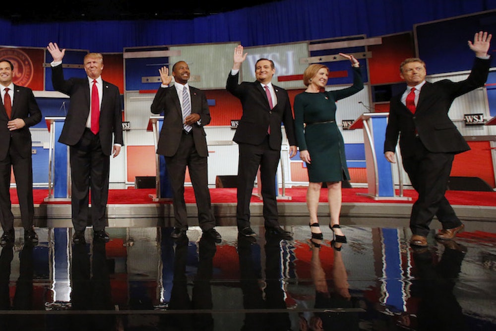Carson and Fiorina mimicked Rubio’s biggest applause line from the last debate, calling Hillary Clinton a liar—a guaranteed winner before Republican audiences, but an accusation none of the candidates have gamed out as a general election attack or imagined defending in a general election debate.