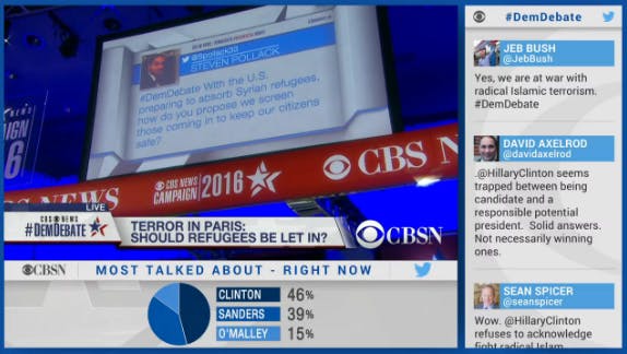 The screen is busy, with three layers, and too many words, and a disorienting diagonal. It’s even worse on the livestream, in which it’s surrounded by tweets and a graphic about “most tweeted issues” or “most tweeted per minute.” That created an absurd moment, just before commercial break, in which a Hillary Clinton tweet in Spanish appeared on screen next to Clinton, as if she were live-tweeting her own performance.