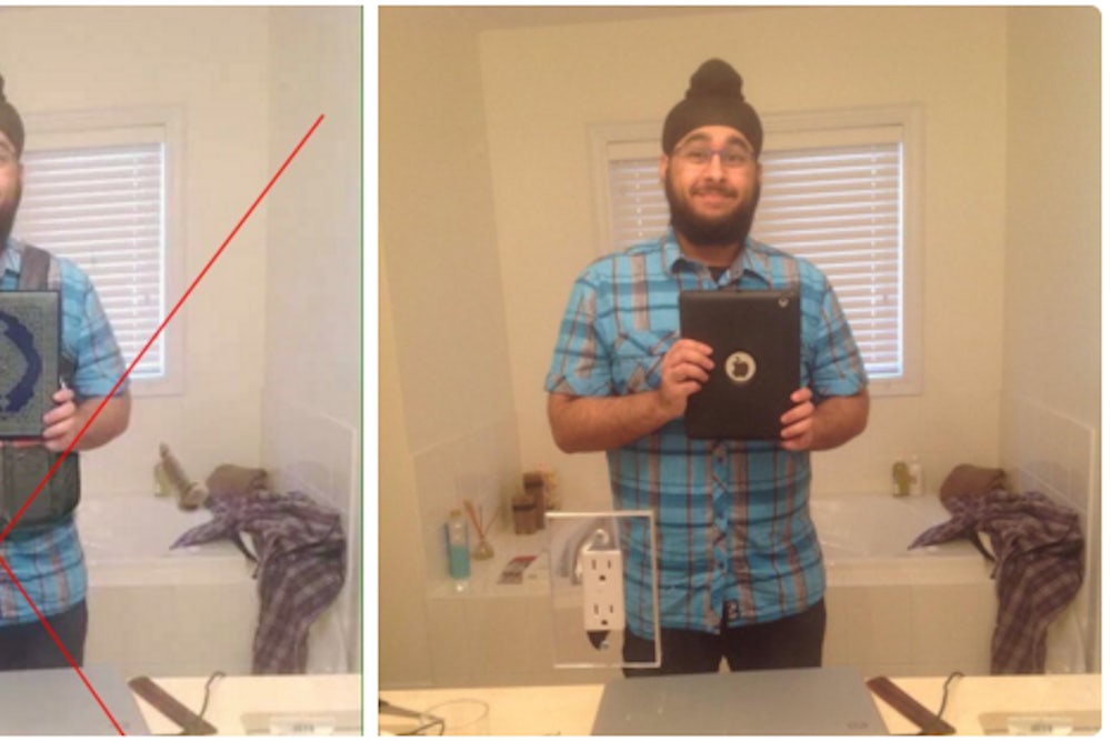 Someone altered the bathroom selfie (above right) of Veerender Jubbal to make him look like he was wearing a suicide vest. His iPad was crudely changed into a Quran. The image spread quickly over the weekend. “The image was even shared by one of the largest—though unofficial—pro-ISIS channels on Telegram, the app that the extremist group used to take credit for the attacks in Paris,” BuzzFeed reports. It was also shared by a few large European news organizations.