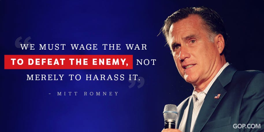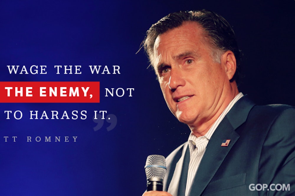 “We must wage the war to defeat the enemy, not merely to harass it,” the quote card shows him saying. But Romney’s brow is furrowed, his lips parted in a grimace, his posture pulled back as though he’s cringing at someone who’s having a coughing fit too close to him. He looks harassed himself.