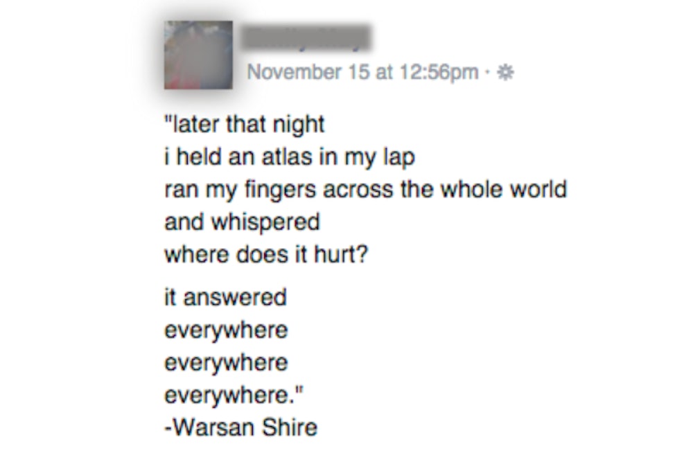 Like Jean Jullien’s Paris peace sign, screengrabs of Shire’s poems are exploding across the social mediaverse, as users look for ways to express grief over the Syrian refugee crisis and, more recently, the Paris attacks.