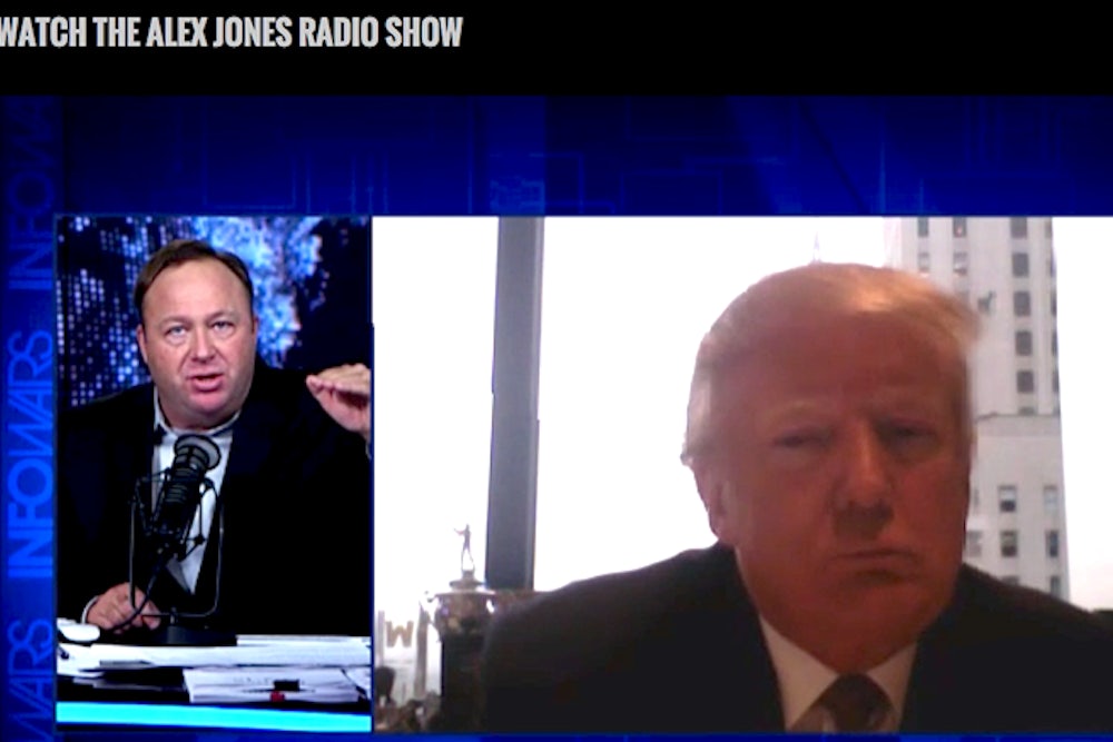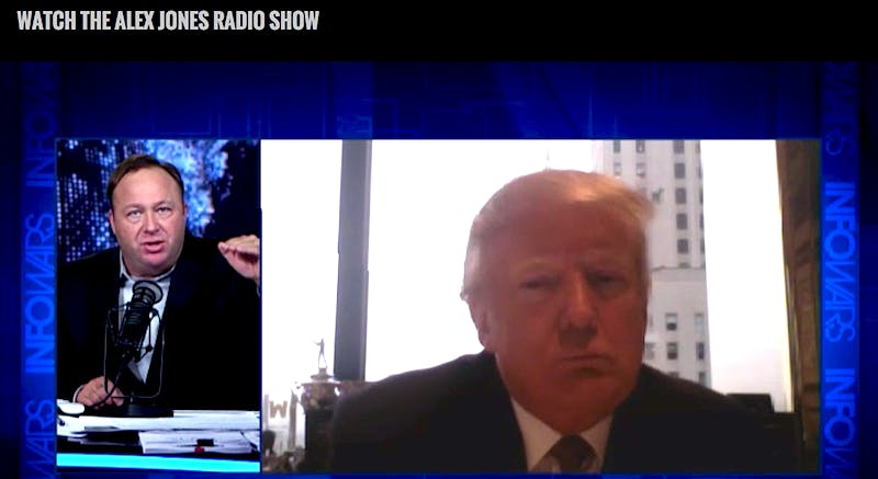Jones followed up: “Are we at a crossroads to decide whether this country’s done or we go to the next level?” Trump didn’t say no and he didn’t say yes. “I think this will be the most important election our country’s ever had—” before admitting humbly, “you have to say George Washington was right there—a couple were pretty important elections.” After a curiously friendly discussion about Trump’s curiously friendly relationship with top Democrats, they returned to classic presidents. “As a man’s man, George Washington was badass,” Jones said. Trump didn’t even fully commit to that one. “That’s what they say,” Trump said. “I mean, that’s what they say.”