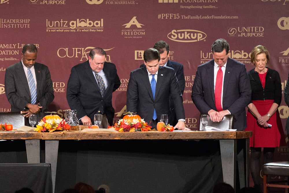The former criticism—that prayer itself a useless, phatic routine—is likely the more offensive one to well-intentioned religious people. It is also the most likely to produce a rhetorical twilight zone where genuine political complaints are received as personal insults, and the most likely to provide people who would rather argue about Culture War issues than gun policy the perfect opportunity to do so. Suffice to say that several victims and their families specifically requested prayers in the wake of the attack in San Bernardino, and it’s hard to fault others for complying and urging others to join. Yet that always-existing secular frustration with the general worthlessness of prayer is a relatively minor footnote in the broader complaint that has emerged about politicians and their praying.
