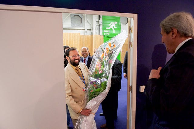 The U.S. secretary of state turns 72 today. And what better way to celebrate than with a large group of fellow world officials in Paris. To mark the occasion, India’s environmental minister Shri Prakash Javadekar apparently raided the Tuileries Garden and presented Kerry with a bouquet of flowers that rivals Kerry’s own 6’4” frame.