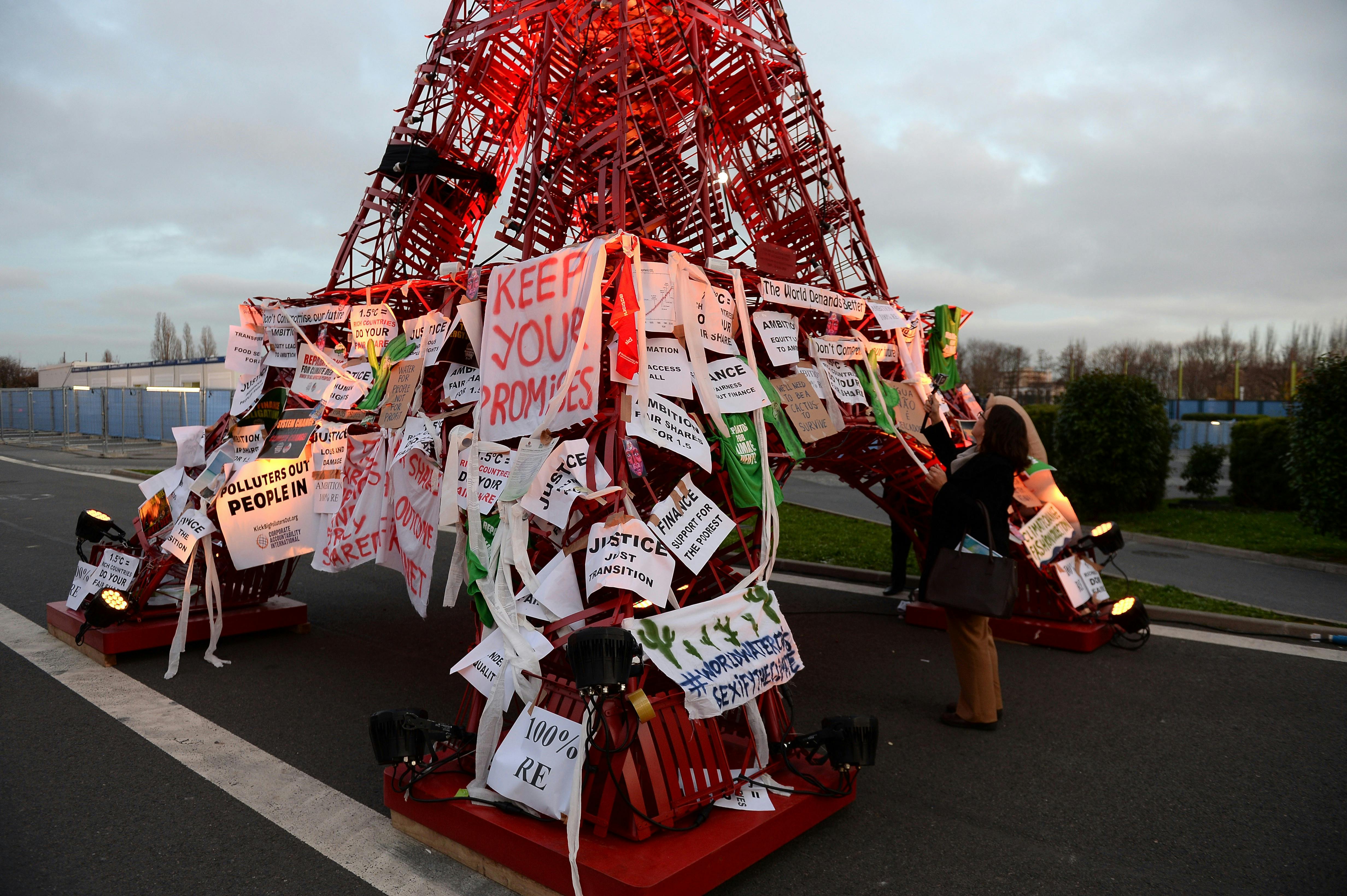 One December 12 protest, which was planned before the ban, will form a symbolic red line near the Arc de Triomphe, with a snake of activists holding red umbrellas and sustainably sourced red tulips—a symbol of the red lines negotiators compromised in their discussions.